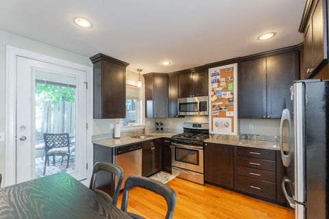 These beautifully renovated (2018) townhouses delivers a refined balance of modern style and effortless living. The kitchen is thoughtfully designed with a quartz-topped island, classic shaker cabinetry, stainless steel appliances, recessed lighting, and a timeless subway tile backsplash, opening seamlessly to a bright living and dining area ideal for everyday living and entertaining. A chic powder room with designer tile completes the main level. Hardwood floors run throughout the home, leading upstairs to a spacious primary bedroom, linen closet, and a spa-inspired bath featuring quartz counters, tiled floors, and a subway tile tub and shower. Recent upgrades include gas Rinnai furnaces and water heaters, updated electrical, and new thermal windows. The full walk-out lower level offers laundry hookups and generous storage. Outdoors, private stone patios with fresh landscaping creates an inviting space for outdoor dining and relaxation. Located near public transportation and parks!